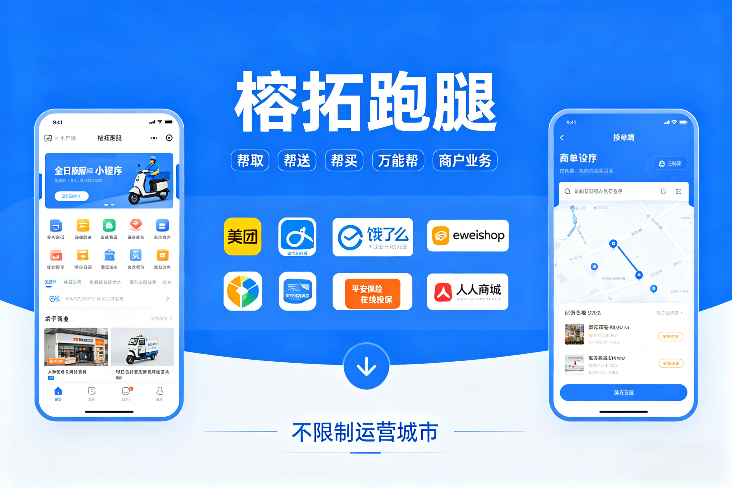 包含帮取、帮送、帮买、万能帮、商户业务功能,用户端和接单端是小程序版、也对接美团饿了么、平安保险在线投保及十多个第三方平台如eweishop、人人商城等,且不限制运营城市。