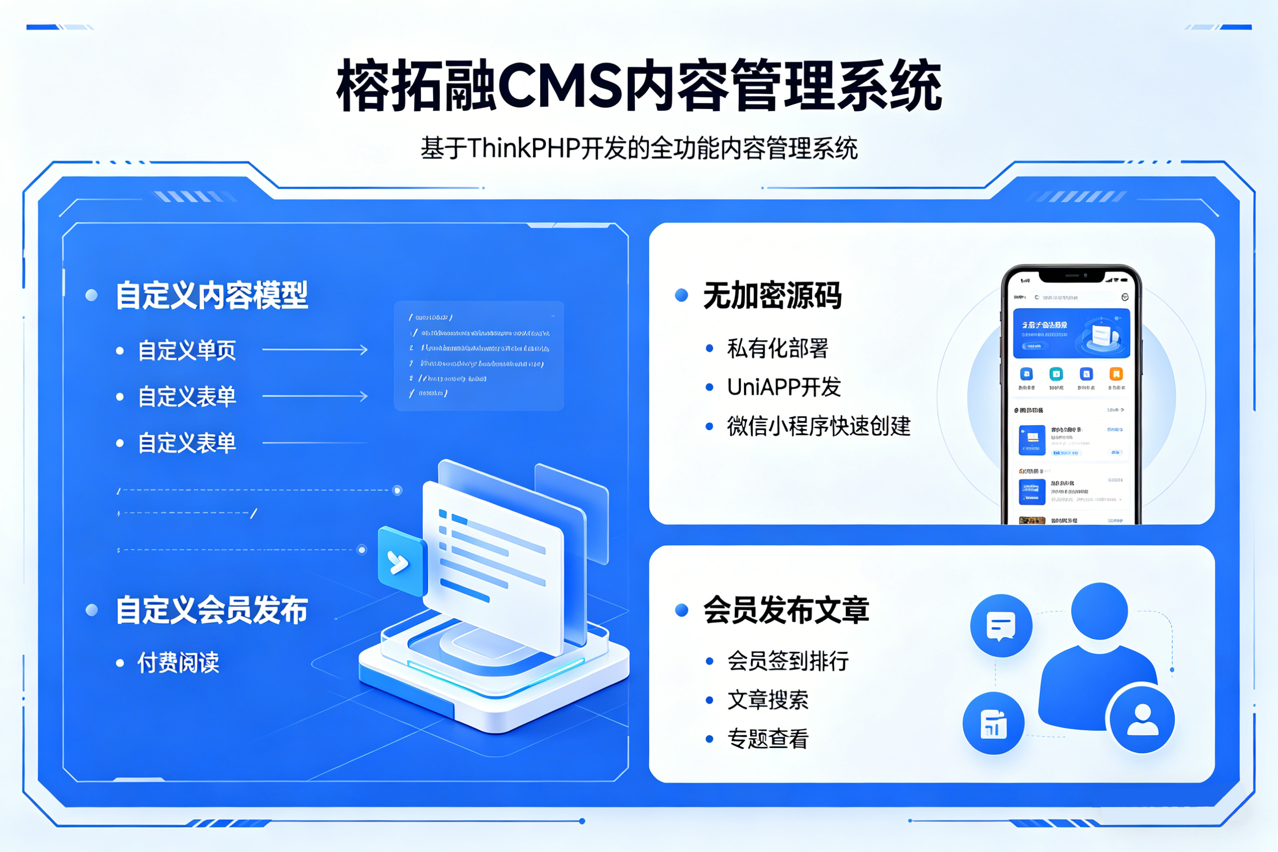 一款基于ThinkPHP开发的内容管理系统,可自定义内容模型、自定义单页、自定义表单、自定义会员发布、付费阅读等功能,提供无加密源码,支持私有化部署。