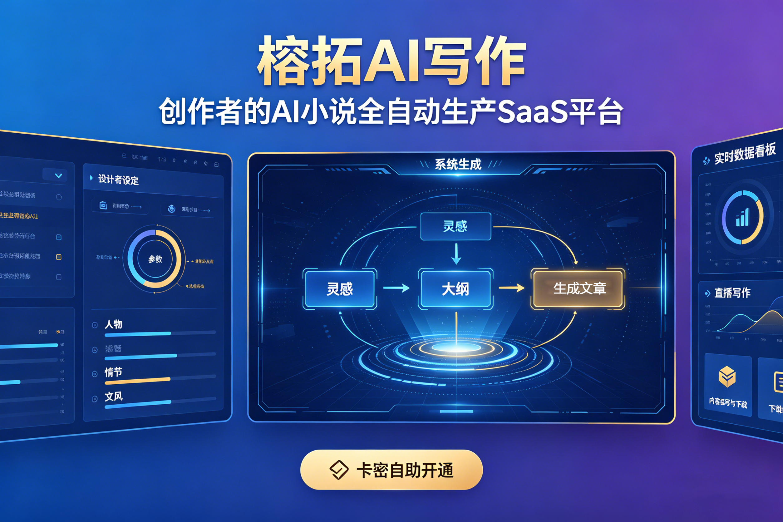 一句话讲清:这是一款面向创作者的AI小说全自动生产SaaS平台,商户通过卡密自助开通,仅需设定人物、情节、文风等参数,系统即可自动完成从灵感、大纲到2000章正文的全程无人化创作,并支持实时数据看板、直播写作及内容重写与下载。
